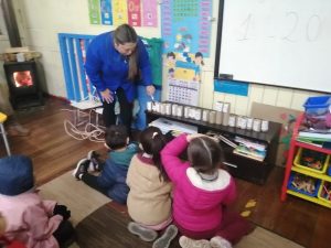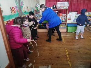 Se realizó juego con conos de confort numerados del 1 al 20. Se formaron a los estudiantes en fila tomando una cuerda. Los que se encontraban en el extremo de la cuerda eran los encargados de ordenar los números como corresponde. Se hicieron cuatro grupos y se animó la competencia.